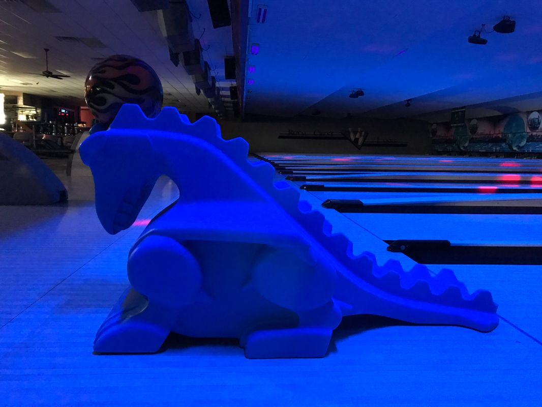 Web Tye using the dinosaur ramp at bowling.